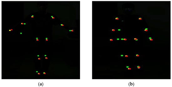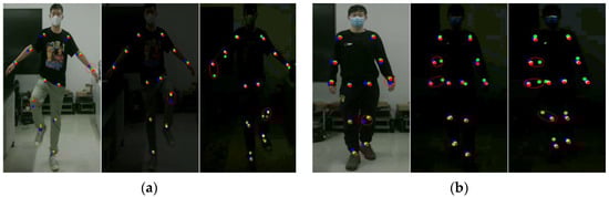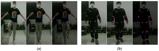 A total of 13 participants’ joint point data were collected in this experiment, and the subjects stood facing the Kinect camera head-on. The three cameras of the Vicon system were located on the upper left, upper front, and upper right of the participants, and there was no occlusion of the participants by other objects. Under the guidance of a professional doctor, we attached infrared reflective marker spheres with a diameter of 14 mm to the limb joints of the subjects, including the shoulder, elbow, wrist, hip, knee, and ankle joints at a total of 12 joints, and the reflective marker points were as close as possible to the centers of the anatomical joints, as shown in the schematic in Figure 2.