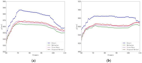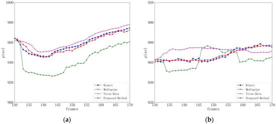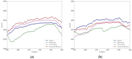 As can be seen from Figure 8, when illumination changes, the right knee joint position obtained by the Mediapipe algorithm has a large deviation from the benchmark data, and the detection accuracy is low. This method is more accurate in the detection of the right knee joint position. By comparing the proposed method with the Mediapipe, OpenPose, and HRNet human key point detection algorithms, the results show that the percentage difference between Mediapipe and the baseline data is 15.34%, the percentage difference between Kinect and the baseline data is 8.93%, and the percentage difference between OpenPose and the baseline data is 12.58%. The percentage difference between the HRNet baseline data is 10.47%, and the percentage difference between the method and the baseline data is 8.84%. When the threshold range is set to eight pixels, the joint accuracy of Mediapipe is 59%, the joint accuracy of Kinect is 81%, the joint accuracy of HRNet is 76%, and the joint accuracy of the method is 84%, as shown in Table 4.