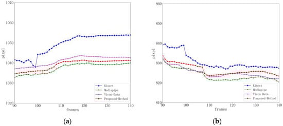 In Figure 4, the red dots represent the key point data visualization results obtained by the method, the blue dots represent the key point data obtained by Kinect, and the yellow dots represent the key point baseline data. These two rehabilitation movements are designed to exercise the body’s balance and coordination abilities, and both emphasize the coordinated movements of the hip, knee, and ankle joints. As can be seen from the above experimental results, the knee and ankle joint positions detected by Kinect have obvious jitters during movement, and the key point detection results deviate from the benchmark data, while the detection results of this method are more stable during human movement, and no joints occur. There is a small jitter problem. Because the lower limb joints are more obviously involved in the rehabilitation exercise process, the right knee joint was selected as a representative to draw the key point position curve.