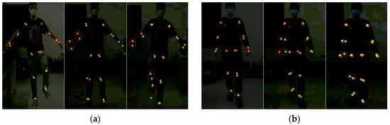 Experiments were conducted in an indoor environment to ensure good lighting conditions, avoiding reflective surfaces and other factors that could affect the performance of the Kinect camera and Vicon system. The Vicon system was calibrated using the Vicon Nexus software (Software version number: Vicon Nexus 2.8.2) and a calibration cross. The Kinect camera was calibrated using a calibration plate. The coordinates of the Vicon marker points were converted to the Kinect coordinate system via a coordinate transformation and then transferred to the 2D image coordinate system via coordinate mapping. Before and after each data acquisition, participants were asked to assume a specific “T” pose as a signal for the beginning and end of the session. Each participant followed the two rehabilitation maneuvers in the text for data acquisition, and each rehabilitation maneuver was repeated five times with the same sequence, for a total of 2 × 13 × 5 = 130 maneuver sequences, and the coordinates of joints captured by the Vicon system and the Kinect camera and the RGB video were recorded. Because the frequency of the Vicon system is 100 Hz and the frequency of the Kinect camera is 30 Hz, to ensure the time synchronization of the two devices, the data captured by the Vicon were downsampled and the frequency synchronized to 30 Hz. When the data were recorded, the timestamps of the data were synchronized to facilitate the time calibration. After time calibration, each frame of data acquired by the Vicon system and the Kinect camera contained the 3D coordinates of 12 joint points of the human body. The number of frames per data sequence ranged from 400 to 1200 frames, depending on the different movement speeds of each participant.