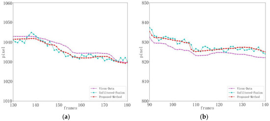 Right knee joint position curve during gait balance function rehabilitation training (key point jitter experiment). (a) Represents the x-position curve. (b) Represents the y-position curve.