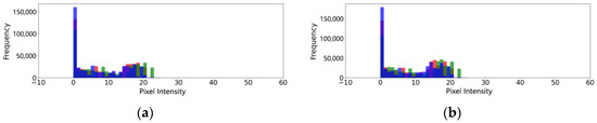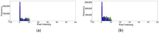 As shown in Figure 14 and Figure 15, the histograms of simulated-light images and real-light images showed good agreement in the location and width of the main peaks in the gait balance rehabilitation training and the center of gravity transfer rehabilitation training. The red bars in the figure, show the intensity distribution of all pixels in the image on the red channel. The green bar, shows the intensity distribution of all pixels in the image on the green channel. The blue bars, show the intensity distribution of all pixels in the image on the blue channel. The other colors present on the graph are due to color mixing when the red, green, and blue bars overlap. We also used two metrics, ssim and psnr, to quantitatively assess the similarity between the generated simulated-light images and the real-light images. The results are shown in Table 12.