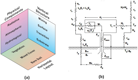 SVAT model’s different architectural components (a) (adopted from the SimSphere user manual (https://courseware.e-education.psu.edu/simsphere/workbook) (accessed on 20 January 2024) and the vertical structure of the plant–canopy model using an Ohm’s electrical analogy are depicted (b), which demonstrates how the SVAT model represents exchanges of H and LE fluxes among the atmosphere, vegetation, and bare soil. Individual model parameters which are used in Figure 1b are defined in Table 1 below (Figure 1b and Table 1 have been adopted from [36,51]).