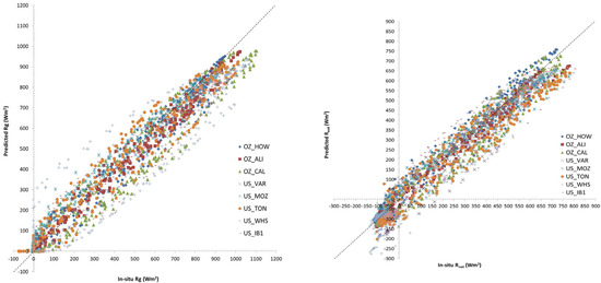 Graphical representation showing the comparisons between SimSphere-predicted and in situ Rg and Rnet fluxes (left and right, respectively) (adopted from [40]).