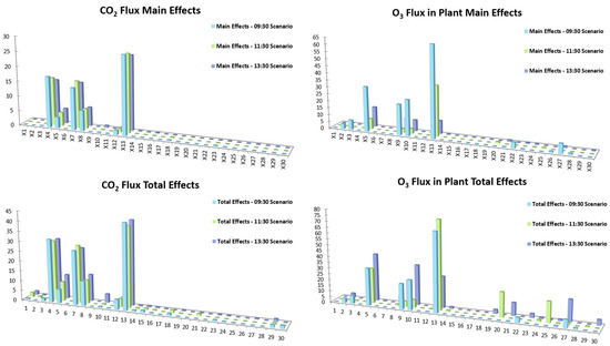 In the context of taking into account the temporal variability of key parameters, ref. [43] employed the GEM-SA tool to evaluate the sensitivity of various model outputs to changes in input parameters (Figure 3). In particular, authors focused on ambient [CO2], the rate of CO2 uptake by the plant, the ambient [O3], the flux of O3 from the air to the plant/soil boundary, and the flux of O3 taken up by the plant, considering (3) different time scenarios. Both the cases of normal and of uniform PDFs for the inputs and the outputs of the model have been investigated. Results indicated that only a small subset of model inputs showed a significant influence on model outputs, mainly in vegetation-related factors, CO2, and O3 fluxes. The external [CO2] and its influence on [O3] and leaves in the air were also highlighted as significant input parameters. Other important factors were the influence of [O3] and [Ca] in the atmosphere, particularly in relation to CO2 canopy output. Parameters such as vegetation height, LAI, Fr, and cuticle resistance (CR) were identified as the most sensitive inputs for most model outputs.
