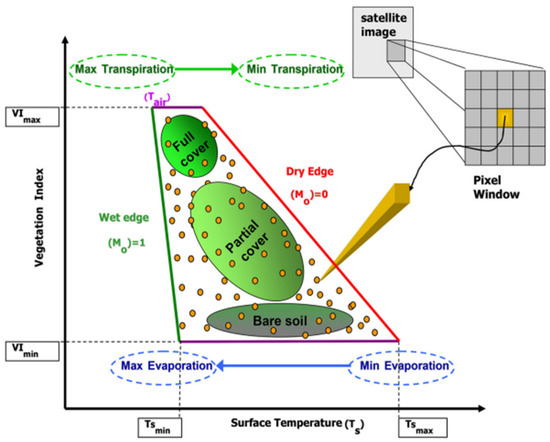 This method is called the “triangle” method due to the triangular (or trapezoidal) shape that emerges when a satellite-derived vegetation index (VI) is plotted against surface temperature (Ts) over a rather heterogeneous area (Figure 4). This triangular feature space is a result of the complex interplay between Ts and VI, with vegetation affecting Ts differently in vegetated areas compared to bare soil regions. The terms “dry edge” or “warm edge” within the “triangle” or “trapezoidal” scheme correspond to the highest temperature points, which include different bare soil and vegetation fractions. Similarly, the “wet edge” or “cold edge” depicts water availability relative to vegetation conditions. The “cold edge” and “warm edge” are essentially the boundaries of the triangle which indicate the physical constraints that control these processes. Pixels with the same VI have the greatest evaporative cooling at the lowest Ts, while pixels with the highest Ts have the opposite effect. A thorough conceptual explanation of the method’s foundation can be found in [38,39,72]. The role of changing soil thermal inertia in influencing Ts is highlighted by the trapezoidal shape that can appear in the scatterplot, rather than a perfect triangle. The factors that influence the formation of Ts/VI, such as soil evaporation, leaf stomatal resistance, Fr, surface moisture status, local meteorology, and incoming radiation, are critical for the reliable interpretation of EO data.