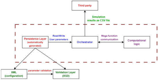 Recent developments in the SimSphere SVAT model’s architectural component have so far focused on developing the model based on service-oriented architecture (SOA) principles in order to improve model’s usability and applicability [37]. The computational logic layer contains an orchestrator that reads XML via a mega-function interface and exports computation results to CSV for third-party applications (Figure 5). The architecture supports two CSV endpoints: one for time-based simulations and another for scenario exploration. The architecture is designed to be stateless, making it appropriate for high-performance computing (HPC) environments and allowing for scalability via stateless clusters. SimSphere–SOA also improves the ease of use of the SA tool, which helps in understanding the model’s behaviour and identifying critical input parameters. In addition, SimSphere–SOA addresses challenges in the original toolkit, such as the lack of model inversion data export, the complexity of manual configuration, and issues related to third-party interfaces and high-performance computing. SimSphere–SOA is built on the principles of SOA to enable adaptable simulations. The serialisation layer generated from the 1.0 document facilitates the integration of XML data into appropriate classes. It is worth noting that this approach is four times smaller in size than manually generated Java code and does not require any prior knowledge of Java. These updates include the integration of new functionalities, resulting in a significant enhancement of the model’s capabilities.