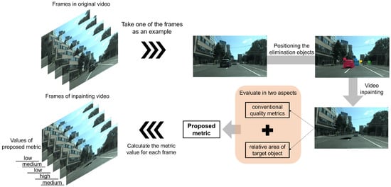Figure 1. Concept of the proposed metric of selecting video frames for extracting the features of the target object. The proposed metric takes into account the quality of frames after inpainted occlusions (set as “car” in this paper) and the relative area of the target object for feature extraction. Based on the conventional image quality-evaluation metric, the correlation between target object areas is calculated so that the relevance between targets in the image is also taken into consideration.
