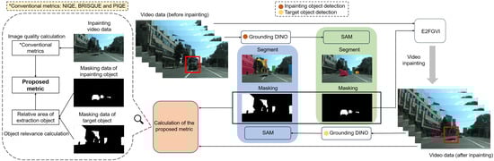 Figure 2. Overview of the calculation of the proposed metric. We extract the position coordinate of the “car” using the Grounding DINO model and input it into the SAM model for more accurate segmentation and masking results. Subsequently, the original video data and the “car” masking data are fed into the E2FGVI model for video inpainting. In the obtained video, the outline of the target object (“building”) becomes clearer. Following this, we also employ the Grounding DINO and SAM models to obtain masking data for the “building”. This, along with the previously obtained “car” masking and video data after inpainting, is used to calculate the proposed metric.