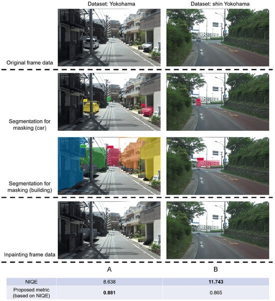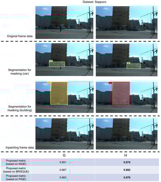 After the above processing, we can gain the mask data for the object “car” in the original video data as A , the video frame after inpainting the “car” using E2FGVI defined as B and the mask data for the object “building” in B as C . We first evaluate the frame image quality after inpainting from the aspect of image data by calculating traditional image quality-evaluation indicators. Specifically, we use three metrics: NIQE, BRISQUE and PIQE.