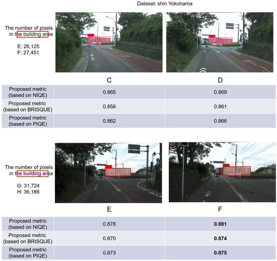 Figure 3. The results in the figure demonstrate the limitations of conventional image quality-evaluation metrics and the effectiveness of introducing object relevance into the proposed metric. The relative area of the building in frame A is larger than that in frame B. Intuitively, frame A is more suitable for extracting building features. However, the results of conventional metrics show that the image quality-evaluation result of frame A is worse than that of frame B. In contrast, the proposed metrics show that frame A is better.
