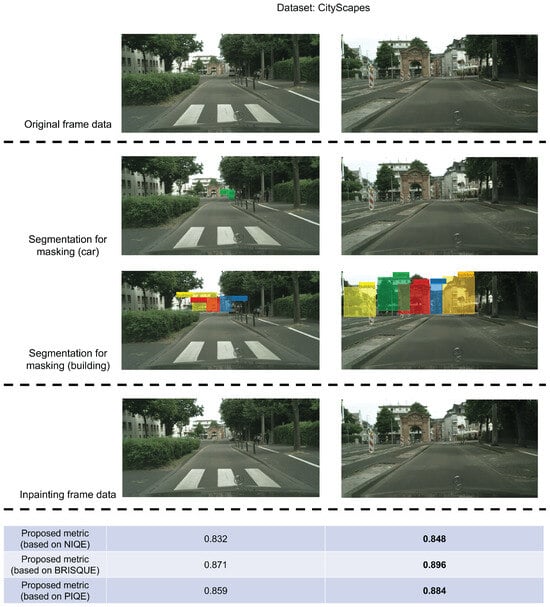 Figure 6. Although the contents of the two frames after inpainting are basically the same. By comparing the original frames, it can be found that after eliminating the “car”-related content, blurring appeared in the processed area, which may affect the recognition of the building’s outline. As shown in this figure, frame K with blurred areas close to buildings has lower scores, whereas frame L with blurred areas far away from buildings has higher scores. The proposed metric can be effective in different scenarios, which further verifies its effectiveness.