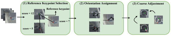 Coarse keypoint adjustment. (1) The reference keypoint is selected as the one having the highest score. (2) Each keypoint is assigned with a consistent orientation. (3) Best matching points (green ones) are obtained using NCC.