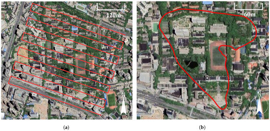 The regular sequence is a 1379-second video that contains evenly distributed air strips across the area. The between-strip overlapping is set at a degree of 40%. The coverage area of this sequence is 860 × 460 and consists of buildings, trees, and playgrounds. On the other hand, the irregular sequence is a 345-s video that follows a heart-shaped loop trajectory. This sequence includes wooded areas, buildings, and a lake, with numerous texture-repeated regions, making it more challenging compared with the regular sequence.