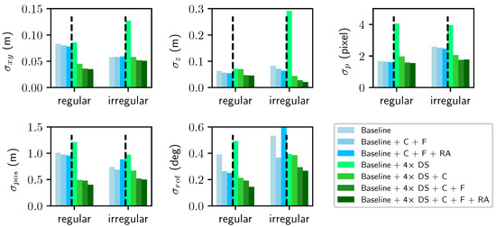 - Absolute trajectory error: ATE is utilized to assess the drift in the position and rotation of the estimated trajectory. The estimated trajectory has been aligned with the ground truth trajectory using Umeyama’s method [54], resulting in aligned poses represented as . RMSEs for the position () and rotation () are evaluated as follows: