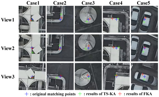 The coarse keypoint adjustment primarily achieves feature matching accuracy at the pixel level. To meet the accuracy requirements of various downstream tasks, it is often necessary to refine keypoints to sub-pixel accuracy. For this purpose, we introduce the feature keypoint adjustment (FKA) method [20]. We first extract a dense feature map of 16 × 16 patches centered on the keypoints by S2DNet [53], and then we treat the refinement of the keypoints, , in a track belonging to the same landmark, l, as an energy minimization problem, as follows: