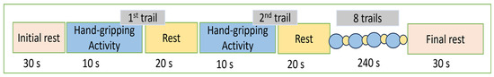 A paradigm for experimental data collection. The total duration per subject is 360 s, with 30 s initial and 30 s end rest intervals separated by 10 trials of 10 s activities and 20 s rest intervals.