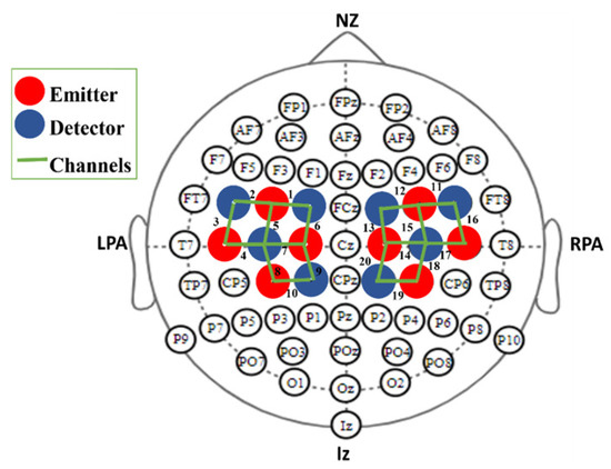 A continuous-wave imaging system (NIRSport2 data acquisition system by NIRx medical technologies (Germany) was used to acquire fNIRS data. Eight emitters and eight detectors were positioned over the motor cortex with a separation of 3 cm [30] according to the 10–20 standard system as shown in Figure 2. Twenty channels were created by the arrangement of optodes (emitter and detectors pair) on the expected motor cortex region.