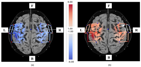 Top view of the topographical map for the hand-gripping activity and rest, where F, B, L, and R are front, back, left, and right sides, respectively. The activity and rest values are represented as changes in the concentration of oxyhemoglobin (μM). (a) Rest and (b) Activity.