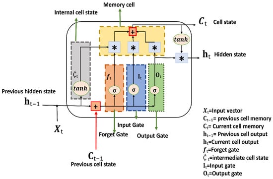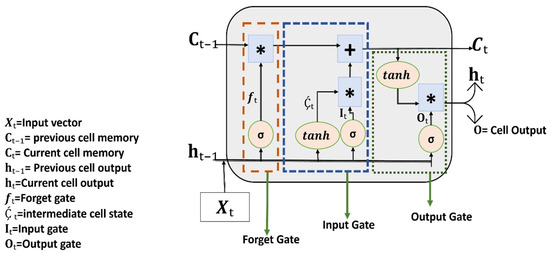 LSTM is an RNN algorithm and introduces gate mechanisms: forget gate, input gate, and output gate, given in Equations (2)–(4). These are used to filter irrelevant information [32]. The sigmoid function for activating these gates assigns 0 and 1 values. In the forget gate, 0 value is to discard the features from the network and 1 signifies that the network should store feature value to update the cell state. The input gate determines and computes new values to update the cell state and the output gate determines which cell states and inputs to the current unit are relevant to the output. The LSTM cell gates depend on the current input value (xₜ), the past hidden state (ht − 1), and biased values (bf, bi, and bo) [33]. Equation (5) presents the candidate cell state (Ḉt) containing new information and passes it to the cell state, depending on the current input value (xₜ) and past hidden state (ht − 1). The activation function for the candidate cell state is tanh, so new information about the cell state is between −1 and 1. If the Ḉt value is negative, new information is subtracted from the cell state when its positive information is added to the cell state at time t. In Equation (6), Ct represents the cell state, and it is the product of the output from the forget gate and the previous cell state which sums up with the product of the output from the input gate and candidate cell state. The cell state represents the memory of the complete LSTM network and brings information about the entire sequence. Equation (7) represents the LSTM hidden state, which depends upon a product of the output gate values and the tangent hyperbolic of cell state [34]. The LSTM cell is shown in Figure 4.