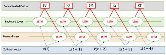 Bi-LSTM, contains a forward layer and a backward layer. Output from both layers is concatenated to yield the final output. Arrows represent the direction of the flow of information between Bi-LSTM layers.