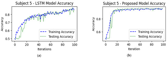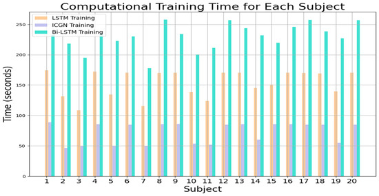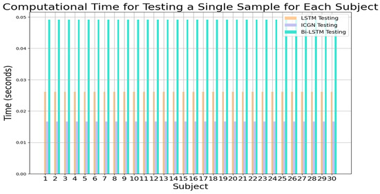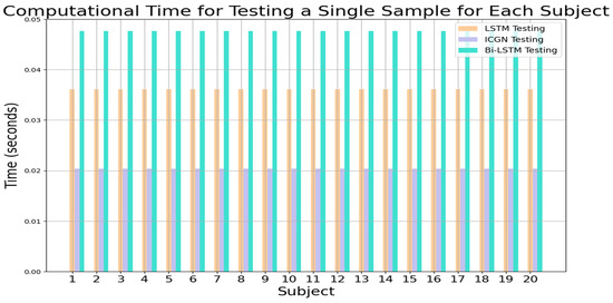 The computational cost of the models is assessed in terms of training and testing time, as shown in Figure 10 and Figure 11, respectively. Training time refers to the time required for the model to train on each subject’s dataset, which includes input data processing, weight optimization, and model convergence. In contrast, testing time indicates the time it takes for the model to make predictions on a single sample of data for each subject, revealing the inference time required for the model to process unknown data. These computational cost analyses shed light on the efficiency and scalability of the proposed model in real-world applications, where time limitations may impact model deployment and usability.