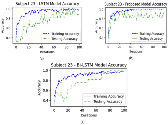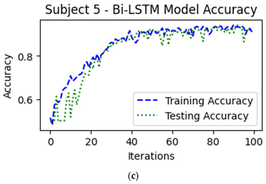 This figure illustrates the algorithms’ training and testing accuracies and represents the performance of (a) LSTM’s performance during training and testing, (b) proposed ICGN algorithm’s performance during training and testing, and (c) Bi-LSTM’s performance during training and testing with the 2-class hand-gripping fNIRS data (HbO).