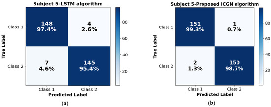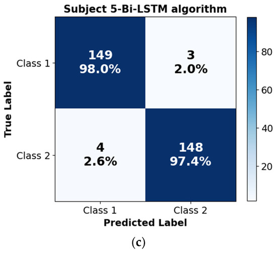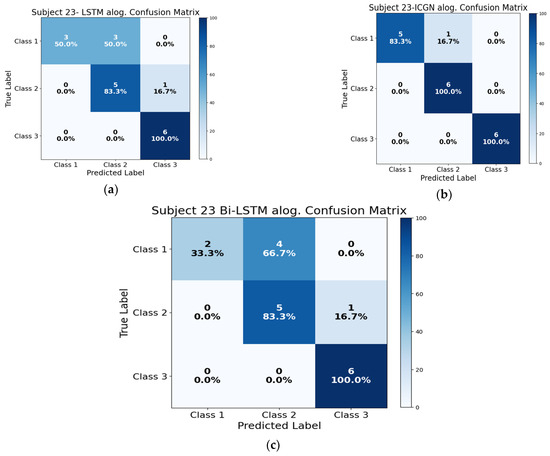 The LSTM, ICGN, and Bi-LSTM algorithms’ ability to correctly classify the instances of a subject is presented in Figure 14. To test the trained models, six samples from each class were used (these samples were excluded during the model training). Figure 14b presents the ICGN algorithm’s test results for subject 23 only, where, in the first row of the confusion matrices, the algorithm correctly predicted five instances of the first class, incorrectly predicted one instance as the second class, and made no errors in predicting instances of the third class. In the second row, the model correctly predicted six instances of the second class and made no errors in predicting instances of the other classes. In the third row, the model correctly predicted six instances of the third class and made no errors in predicting instances of the other classes.