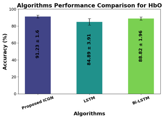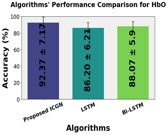 An analysis of the classification accuracy performances of LSTM, the proposed ICGN, and Bi-LSTM is depicted in Figure 9. The bar graph presents a comparative examination of the accuracy values attained by these algorithms. Notably, with a significantly high accuracy rate of 91.23 ± 1.60%, the ICGN algorithm continuously outperformed the LSTM and Bi-LSTM classifiers. These results emphasize how well the proposed ICGN can capture complicated patterns in the fNIRS data.