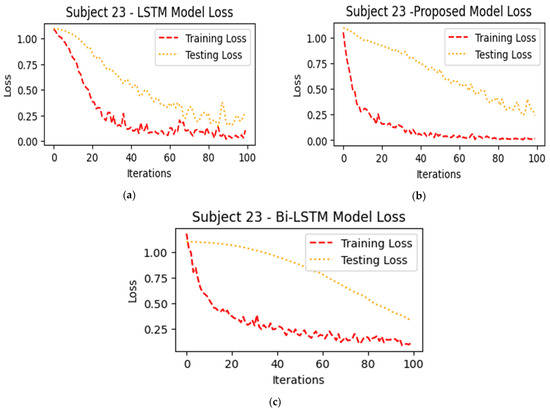 This figure illustrates the algorithms’ losses and represents the performance of (a) LSTM, (b) proposed ICGN, and (c) Bi-LSTM algorithms trained with 3-class open access fNIRS data (HbO).