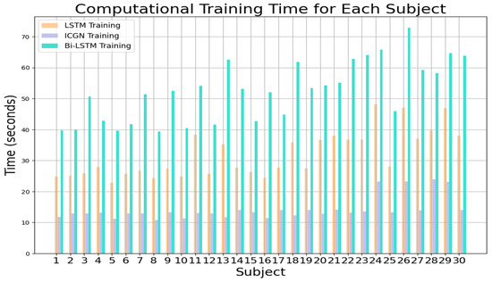 LSTM, ICGN, and Bi-LSTM algorithms’ average training time required for each subject for 3-class data.