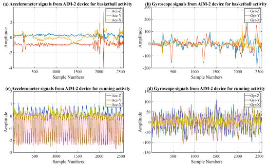 Sample accelerometer and gyroscope raw sensor data (20 s) collected from participant 101 by the AIM-2 device ((a,b): basketball activity; (c,d): running activity).