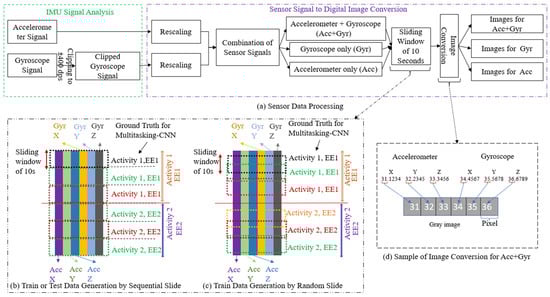 The training and validation datasets were produced using sequential and random windows (Figure 3b,c). The sequential window was precisely aligned with the activity boundaries, and the ground truth was generated based on the corresponding activity label and EE (Figure 3b). In contrast, the starting point of random windows (Figure 3c) was selected randomly, which can be considered a form of data augmentation. The testing dataset was produced using only sequential windows. Grayscale images from the sensor combination Acc+Gyr, Acc, and Gyr were saved for both AIM-2 and AG devices. Image tensor sizes (heigh×twidth×chanel) were 1280 × 6 × 1 for Acc+Gyr, 1280 × 3 × 1 for Acc, 1280 × 3 × 1 for Gyr in AIM-2; and 1000 × 6 × 1 for Acc+Gyr, 1000 × 3 × 1 for Acc, 1000 × 3 × 1 for Gyr in AG.