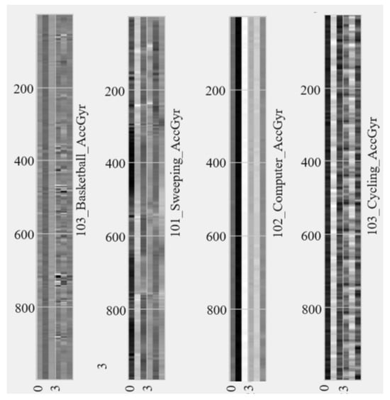 A sliding window of 10 s was applied to the grouped sensor data, which was then saved as a grayscale image (Figure 4). The choice of window size significantly affects EE and PAR performance. A shorter window aids in fast-tracking and transitions but may result in false positives. Previous studies [] suggest a 10 s window with a 55 Hz sampling rate is optimal for activity recognition. Further research [] examined various sensors and data from 20 participants in 52 activities, indicating that longer windows generally improve PAR, except for short activities. A parallel trend emerged in EE-focused research articles. For instance, in [], researchers utilized a 10 s window for EE estimation. Subsequently, a more exhaustive study detailed in [], encompassing 100 young participants, underscored that a 10-s window size yields a reduced estimation error for EE. Hence, we chose a 10 s window for a balanced PAR and EE estimation performance. The sliding window operation was performed for each activity and participant’s data, with no overlap between windows from different activities or participants.