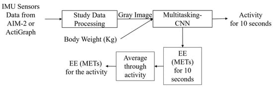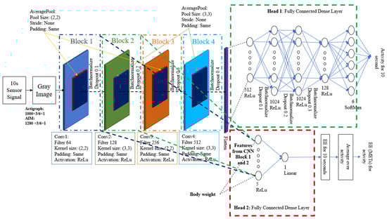 Our proposed model (Figure 5) integrates the computation of PAR and EE estimations into a single operation. The IMU sensor data are converted into grayscale images and supplied as input to the Multitasking-CNN model. Given the pivotal role of body weight in determining EE, this value was incorporated as an additional external input to the Multitasking-CNN. Multitasking-CNN comprises a CNN model with a fully connected dense layer. Despite the computational complexity of CNN-based deep learning models, they eliminate the need for handcrafted feature selection, a step in traditional signal processing methods. The latest microcontrollers include low-power hardware for acceleration of inference in deep neural networks, thus enabling the use of deep learning in wearables. Therefore, we opted for a deep learning-based approach. The subsequent section provides a more detailed description of Multitasking-CNN.