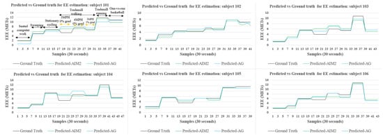 Figure 7 presents the predicted vs. actual EE estimation for the best-performing models with data from the AIM-2 and AG devices. The EE estimation is depicted for six activities, including “seated computer work”, “sweeping”, “stationary cycling”, “treadmill walking with different paces”, “treadmill running”, and “one-vs.-one basketball” in that order. Note that participant 105 did not perform “seated computer work”, so “sweeping” was their first activity.