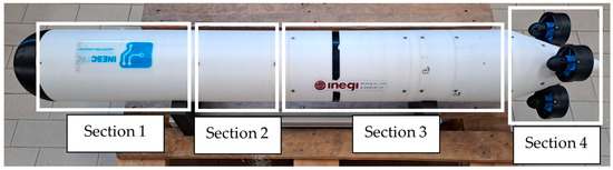 To explore potential advantages of a buoyancy-driven device on energy consumption, the authors developed a prototype with a VBM as documented in several previous works, like, for instance, in [19]. The VBM is designed for integration into small-sized AUVs based on modular building blocks or to be independently used as a buoy for vertical profiling missions. The prototype underwent enhancements, as described in [14], which introduced a Main Control Unit (MCU), for autonomous operation. Within the MCU, there is an Arduino Uno and a Turnigy high capacity 14.8 V Cell Battery to supply power to the whole prototype. In this setup, a Gravity IC Digital Wattmeter was included to measure the power consumption of the prototype actuating devices. This sensor provides readings for (i) current with a range of 0 to ±8 A with a 1 mA resolution and ±0.2% full-scale relative error, (ii) voltage with a range of 0 to 26 V with a 4 mV resolution and ±0.2% relative error, and (iii) power with a range of 0 to 206 W with a 20 mW resolution. Building on these enhancements, the present study incorporated a Propeller Module (PM) into the prototype, facilitating energy consumption comparison. Depicted in Figure 1, the prototype is composed of four main sections: Section 1 is the MCU, Section 2 is an intermediate section for floatation foam and Sections 3 and 4 are the VBM and the PM, respectively. Its full length is 1616 mm with an outer radius of 200 mm and its dry weight is 36 kg. Buoyancy change is achieved by pumping seawater via a diaphragm-sealed piston mechanism. The piston is driven by an electrical motor coupled to a mechanical transmission and a spindle. This VBM allows a total volume change of approximately cm3 and can operate up to 100 m. Further details of the VBM can be found in [14].