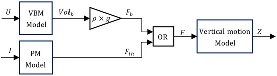 In Figure 2, and I are the control actions to either the VBM or the PM, respectively; is the prototype depth (which increases with increasing depths); and is the force responsible for driving the prototype vertical motion (positive increases buoyancy, leading to decreasing depth). The force can be either , the propeller thrust, or , the variable buoyancy force. is the variable buoyancy volume of the prototype, which generates the variable buoyancy force . External disturbances are accounted for in the vertical motion model as will be described in the next section.