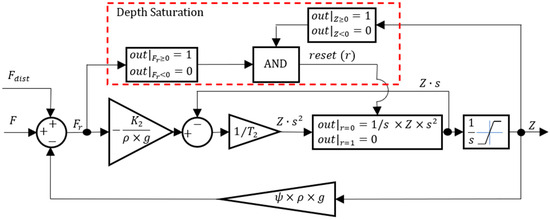 In Figure 3, and are the depth dynamics parameters identified in [19]. is the water mass per unit volume, is the acceleration of gravity, and is a parameter expressing the loss of volume per meter depth due to the variation of volume of the prototype structure. is a disturbance force acting on the vehicle, such as a water density variation or an error during the neutral buoyancy trimming of the prototype, and is the resultant force acting on the prototype. The model developed in [19] is valid when the prototype is completely submerged. However, in many practical situations, the prototype is floating at the water surface level. For this reason, the depth is saturated so that it is never negative. When is saturated and is negative, the integral of the prototype acceleration is reset to zero, so that only when the direction of is away from the surface can the integration of the acceleration start.