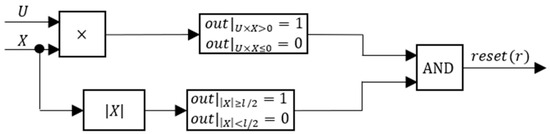 As seen in Figure 6, the reset signal rises to 1 when both the actuator position module is greater or equal to half the stroke and the control action has the same sign as the actuator position. In this manner, when the limit switch is triggered, the actuator is free to move towards the center of the stroke but not in the opposite direction.