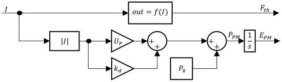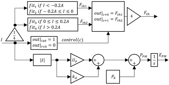 Considering the polynomial fits, the PM model from Figure 9 can be updated to the block diagram of Figure 11, where and are the negative and positive propeller thrust forces, respectively. When the current is positive, the control signal rises to 1 and the resulting thrust ; otherwise, . It should be underlined that the data presented in Figure 10 are the characteristic curve for each propeller individually. Since the prototype has four propellers, the controller’s current demand is distributed evenly among them, with one fourth allocated to each. The overall force is thus four times the force provided by each propeller, as detailed in Figure 11.