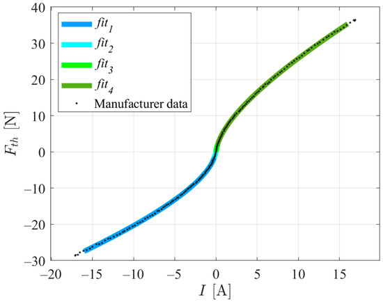 As stated in Section 2.4, the PM model was obtained using the Bollard thrust values experimentally determined by the manufacturer in [20]. These values are presented in the dotted curve of Figure 10. From the thrust and current drawn values for a 12 V power supply, for each rotation direction, a second-order polynomial was fitted using the least-squares method and forcing an origin interception. Figure 10 presents the experimental data provided by the manufacturer and four polynomial fits, , =1…4, where is represented by Equation (14) and a smooth transition between and and between and is ensured: