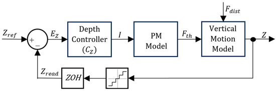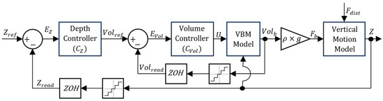 Regarding both Figure 12 and Figure 13, notice that each feedback branch has a Zero-Order Hold (ZOH) to model the signal acquisition between Arduino loops and a Quantizer block, accounting for sensor acquisition resolution. is the depth error between the reference depth and the depth signal calculated using the pressure read by the pressure sensor. In each control architecture, there is a depth controller . The output of for the PM model is the current and the output of for the VBM controller is the reference volume . The input for is , the volume error between and the volume signal read by the position sensor . The output from is the control action for the VBM.
