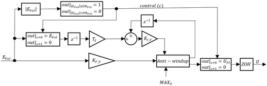In Figure 15, and are the integral and proportional gains, respectively, and is the sampling time. To save energy, a volume deadband is included, such that when the volume error is smaller than , the control signal rises to 1 and the VBM is switched off. When this happens, the integrator input is set to zero to freeze the integrator. The PI controller action is saturated to avoid exceeding the linear actuator input voltage range. Also, the ZOH block was added to simulate the holding of the control action calculated value between Arduino sampling instants.