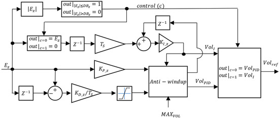 To counteract possible disturbances acting on the prototype, each controller requires an integral action. To avoid integrator windup, an anti-windup scheme was implemented as presented in Figure 14. In this figure, , , and are the proportional, derivative, and integral control actions, respectively; is the maximum value that the control action can take; and is the integral of the error. Whenever the control value equals or exceeds for two consecutive time instants (), the value of is limited to and the value of is calculated so that is also . Integrator windup is thus prevented.