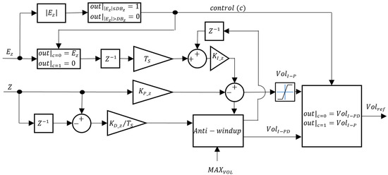 In Figure 16 and Figure 17, , , and are the integral, proportional, and derivative gains, respectively. A depth deadband was implemented in the VBM : when the absolute value of the depth error is smaller than , the control signal rises to 1 and the integrator is frozen. Unlike the , in this situation, the controller output is not zero but rather in the PID or in the I-PD. This ensures that if there is a constant disturbance, the integral part that counteracts it is still affecting the input. To limit the maximum value of the derivative action in Figure 16, due to possible excessive values whenever, for example, there is a step reference input, its value is limited to .