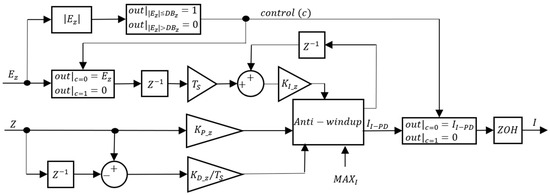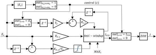 As seen in Figure 18 and Figure 19, a was also implemented in the PM depth controller, inside which the integrator is frozen. Since, in this case, the output is the PM model input, when inside the deadband, the PM is switched off to save power. There is an anti-windup scheme to avoid saturation and integrator windup and the maximum value of the derivative action in Figure 18 is limited to . The calculated value is again held with a ZOH to simulate the discrete time Arduino behavior. Table 4 lists the 12 different control structures tested.