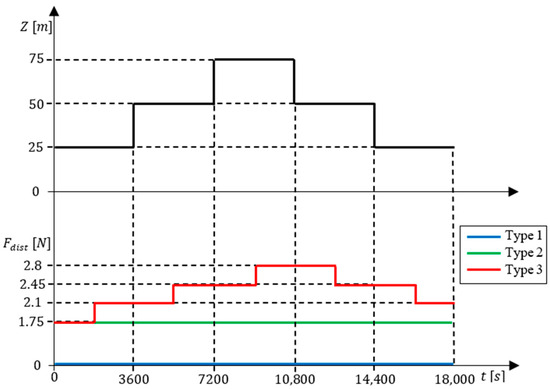 Depth reference signal (upper graph) and disturbances for each test type (lower graph).
