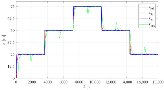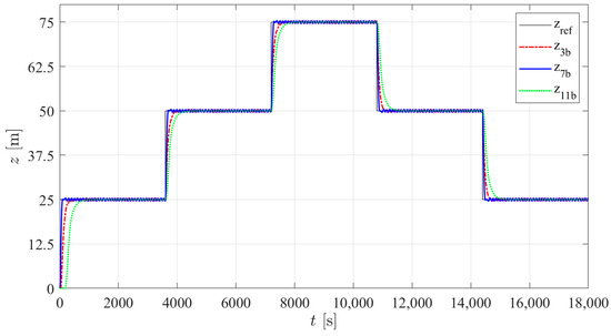 According to the results presented in Table 7, three structures were selected with the lowest average energy consumption in the three types of tests. Among PID structures 1 to 4, tuning b of structure 3 was selected; among I-PD structures 5 to 8, tuning b of structure 7 was selected. As previously mentioned, no significant changes between the results of the different controller structures in PM were found, so among structures 9 to 12, only one controller (tuning b of structure 11) was selected. Figure 21, Figure 22 and Figure 23 show the simulated prototype depth during the three tests with the selected control structures. No significant overshoot is noticed in any of the responses and the VBM is faster than the PM. A delay in the first step is observed in type 2 and 3 trials. This is caused by the fact that for the first step, the integral part of the controller takes time to reach the value that will counteract the constant disturbance. In the case of controller 11b, this is particularly noticeable due to the low integral gain tuning required for low energy consumption.