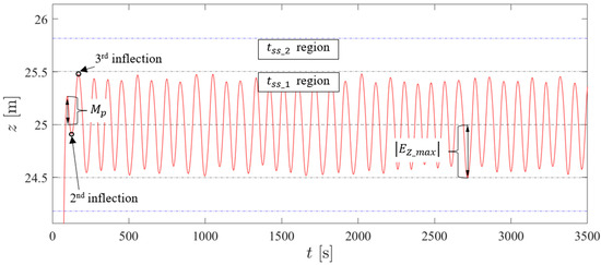 To assess the performance of the selected control structures, conventional linear behavior metrics could not be used as the deadbands induce a nonlinear behavior. For this reason, several average performance metrics obtained in each test were adopted in this work: average overshoot , average maximum error magnitude , average settling times and , and average disturbance error magnitude . Figure 24 presents a graphical representation of these performance metrics. The number of inflection points is counted after the system response crosses the target reference. is defined as the maximum error after the third inflection point of the vehicle for each new reference. is the time it takes for the prototype to reach the ± band of its own control structure, while is the time it takes for the vehicle to reach the ± band of the control structure that led to the highest in its respective test. is the maximum error after a new disturbance. Table 8 presents the performance obtained for the previously selected controllers, as well as the energy consumption repeated from Table 7, for an easy assessment of the trade-offs between performance and energy consumption.